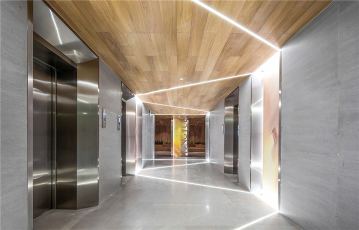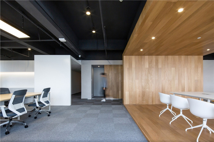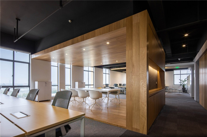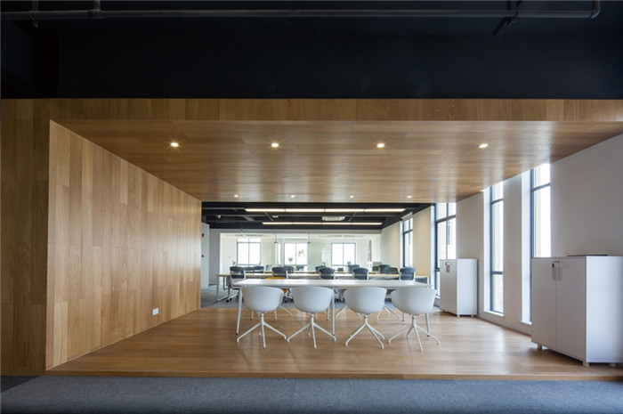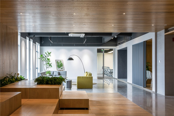 設(shè)計(jì)打破原本的格局,將更多的開(kāi)放空間提供給辦公者。去除建筑內(nèi)部承重柱與設(shè)備管井以外的輕質(zhì)隔墻,解放閉塞的隔間,形成開(kāi)敞的辦公環(huán)境,滿(mǎn)足人數(shù)眾多的電商部集中辦公。通過(guò)“盒子”形體的組接與排列,重組了立柱與井道密布的區(qū)域,形成了對(duì)應(yīng)大空間功能的輔助綜合區(qū)。結(jié)合接待區(qū)與生活區(qū)的布置,營(yíng)造了自然、積極、高效、專(zhuān)注,并有歸屬感的辦公氛圍。