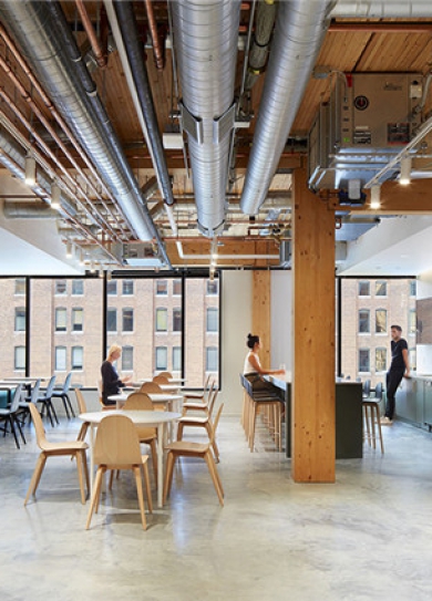 標簽: 咖啡廳裝修設計 工業(yè)風咖啡廳裝修方案 READ MORE明尼蘇達州健康零食制造商Flagstone Foods,位于明尼阿波利斯的新總部辦公室裝修設計最近投入使用。木色、駝色、奶油色、棕色和暗灰調的綠色,共同構筑出一個充滿故事性的溫暖時尚空間。下面就跟隨鄭州辦公室裝修專家宏鈺堂裝飾小編一起來欣賞吧!新環(huán)境不僅有一處大型咖啡吧和公共廚房,還設有一系列功能多元的協(xié)作區(qū)和會議室。最核心的一大功能設置就是測試廚房,它以全新的方式加強了企業(yè)和客戶之間的親密互動,