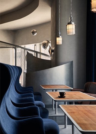 標(biāo)簽: 豐田辦公室裝修設(shè)計(jì) 辦公室裝修設(shè)計(jì)方案 READ MORE三谷是一家綜合業(yè)態(tài)的餐吧,白天是西餐模式,夜晚則變成一家酒吧。這樣的復(fù)合業(yè)態(tài),既要保證餐廳的通透性,又要保持酒吧模式相對(duì)的神秘感。于是,餐廳裝修設(shè)計(jì)公司運(yùn)用斐波那契螺旋線做了一個(gè)玄關(guān)。螺旋的曲線起到了引導(dǎo)人流的作用,也提供了相對(duì)的私密性。金屬網(wǎng)作為隔斷材質(zhì),契合主題又保證相對(duì)的透光性。 在色彩上專(zhuān)業(yè)餐廳裝修公司選擇了大部分的灰色作為基底,為了契合主題,在點(diǎn)綴色上使用了郵輪經(jīng)典的紅藍(lán)配色。