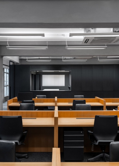 這是街頭時尚品牌——“HI PANDA”辦公樓的室內(nèi)設計與外觀設計。辦公樓分為3層,位于上海市中心。場地形狀豎長,建筑和前面停車場合計全長約80米。辦公樓場地北側(cè)有一個專有的中庭,(與市中心其他地方相比)擁有較為優(yōu)越的外部環(huán)境條件。下面就隨鄭州專業(yè)辦公樓裝修公司宏鈺堂裝飾一起來欣賞?! ∥覀冊谧鲈O計時,為了充分利用豎長的室內(nèi)外環(huán)境,將最主要的地面層視作室內(nèi)外連同的空間。具體手法是,拿出了一層的