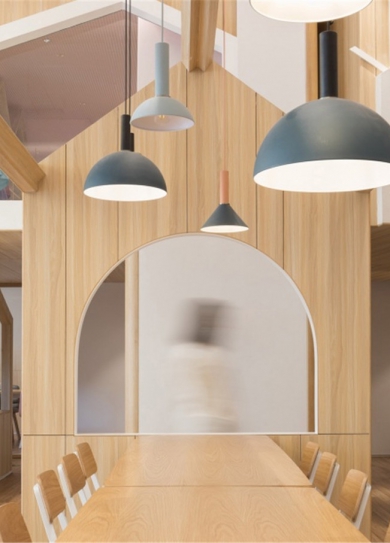 標簽: 總部辦公樓裝修 服飾總部辦公樓裝修 READ MORE在維塔蘭德親子餐廳設(shè)計中,“樹屋”的概念貫穿了整個餐飲空間,一個個錯落在空間里的小房子構(gòu)成了不同的兒童體驗空間,與就餐的大堂形成半圍繞的結(jié)構(gòu),空間疏密相互呼應(yīng)。蔬菜與水果是餐廳的vi形象主體。一棵巨大的西蘭花在入口處以歡迎的姿態(tài)迎接到訪的客人,原本是大多數(shù)小朋友最“畏懼”的蔬菜,一下子活潑可愛起來。穿過白色的的鞋柜與展示架組成的玄關(guān),跨過拱形的門洞就算是正式進入到這個“兒童與父母的樂園了”。下面就